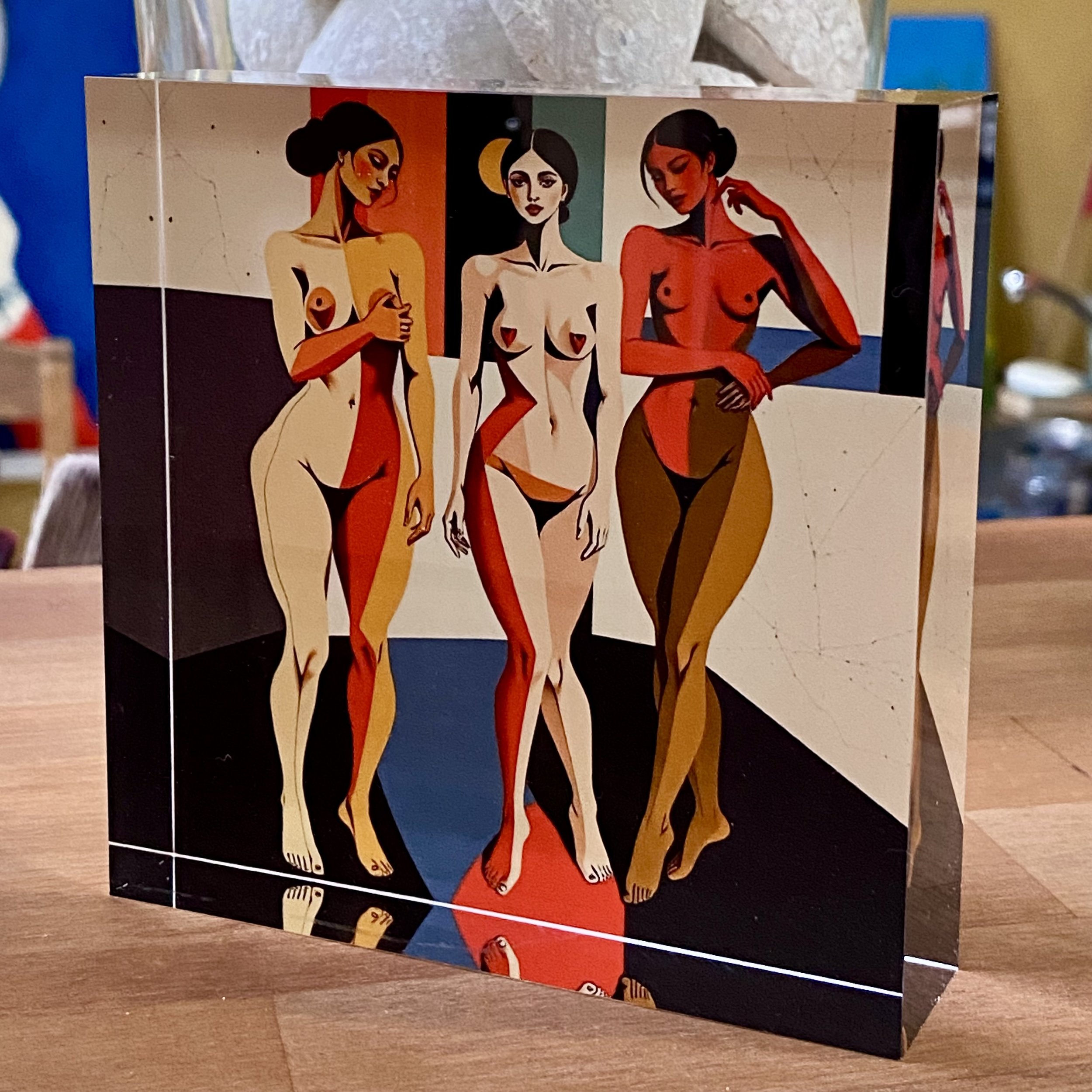 Akryl-blok er et livagtigt tryk af et billede; vist på en krystalklar blok af akryl-glas