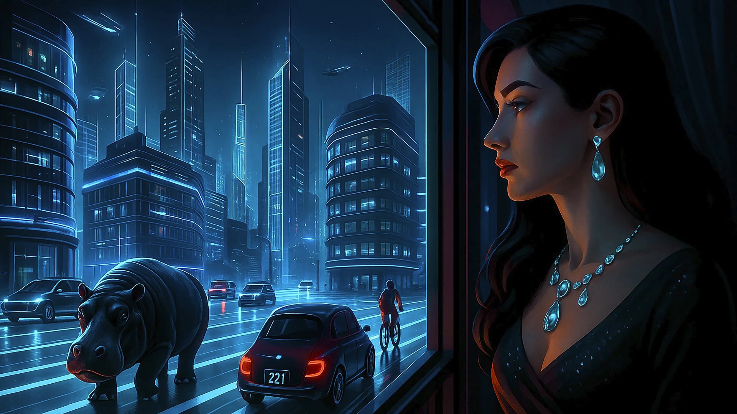 Dyr og køretøjer: Tilstedeværelsen af et flodhest, der går sammen med biler og cyklister, antyder en blanding af naturligt og byliv, muligvis symboliserer det harmoni eller kontrast mellem natur og teknologi.
