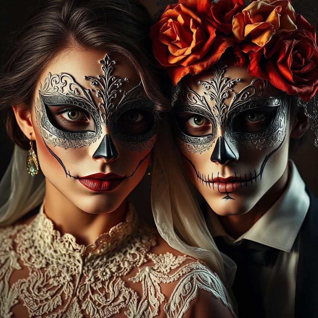 Dette kunstværk viser et par iført indviklet designet sukkerkraniemakeup, forbundet med den mexicanske fejring af de dødes dag. Makeuppen inkluderer detaljerede og symmetriske mønstre med et sølv- og blomstermotiv, der fremhæver deres øjne og pander.