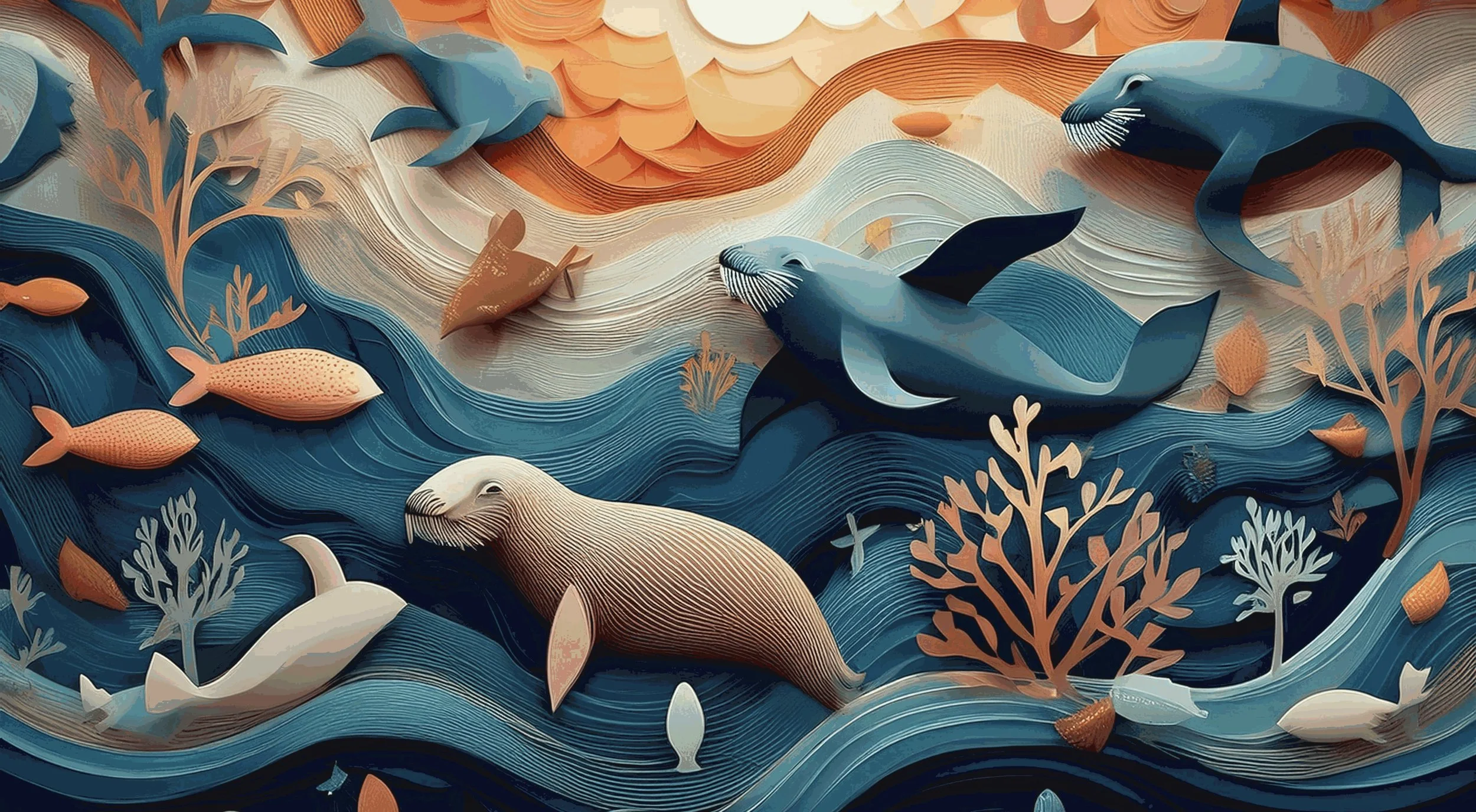 Billedet er en levende og kunstnerisk skildring af et undervandsscene. Det viser farverige fisk, der svømmer i et hvirvlende blåt hav med forskellige korallignende strukturer. Solen ovenover er afbildet med cirkulære stråler, der tilføjer varme til scenen. Hele billedet har en papirklipstil, der giver det et tekstureret og lagdelt udseende. Brugen af klare farver som orange, blå og hvid skaber en livlig og dynamisk atmosfære.