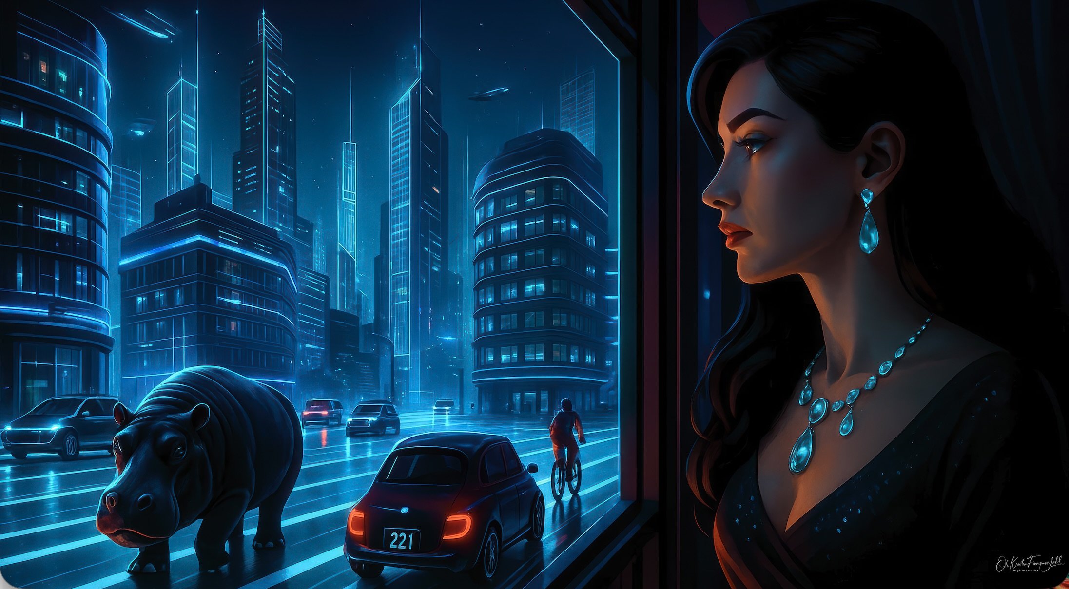 Symbolisme: Kombinationen af elementer som flodhesten, det højteknologiske bybillede og den elegante kvinde kan fortolkes som en kommentar til balancen mellem natur, teknologi og menneskehed.