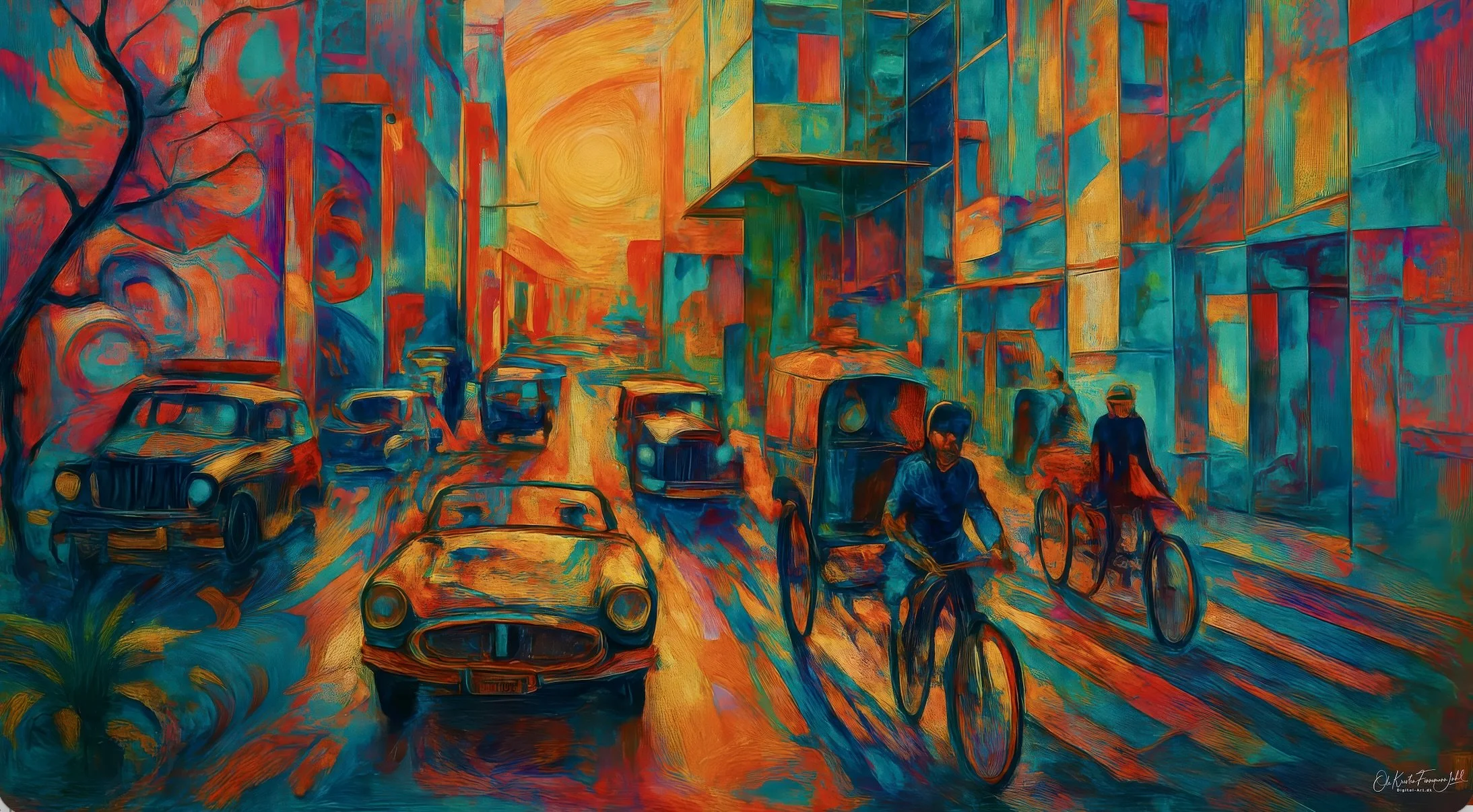 Maleriet skildrer en travl bygadescene med levende, varme farver, der skaber en dynamisk atmosfære. Brugen af røde, orange og blå farver giver indtryk af en intens solnedgang, der kaster lange skygger og bader byen i et livligt skær. Scenen indfanger en blanding af veteranbiler og cykler, hvilket antyder en blanding af gammelt og nyt, en overgang mellem forskellige æraer. De flydende penselstrøg og abstrakte elementer formidler bevægelse og energi, der afspejler bylivets travlhed. Maleriet fremkalder følelser af nostalgi og livlighed og fejrer den konstante bevægelse og forandring i et bymiljø.