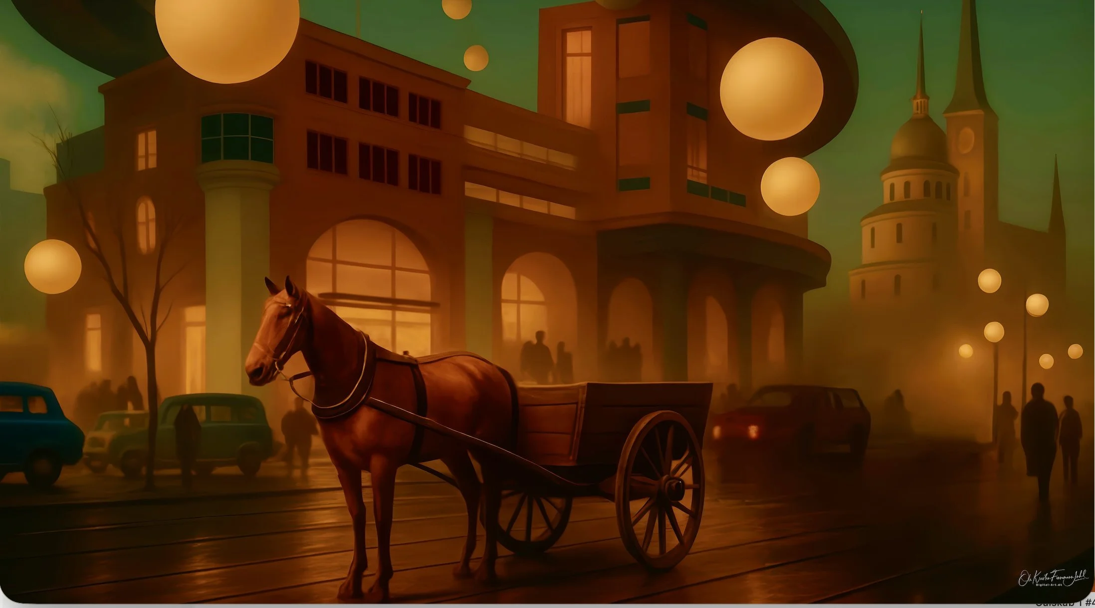 Dette kunstværk skildrer et surrealistisk, tusmørkeagtigt byscene med en hestevogn på en gade. Baggrunden er en blanding af moderne og historisk arkitektur med store, glødende kugler, der svæver over hovedet og kaster et varmt lys. Silhuetter af figurer befolker gaden og bidrager til den drømmeagtige atmosfære. De kontrasterende elementer skaber en følelse af tidløshed og fantasi.