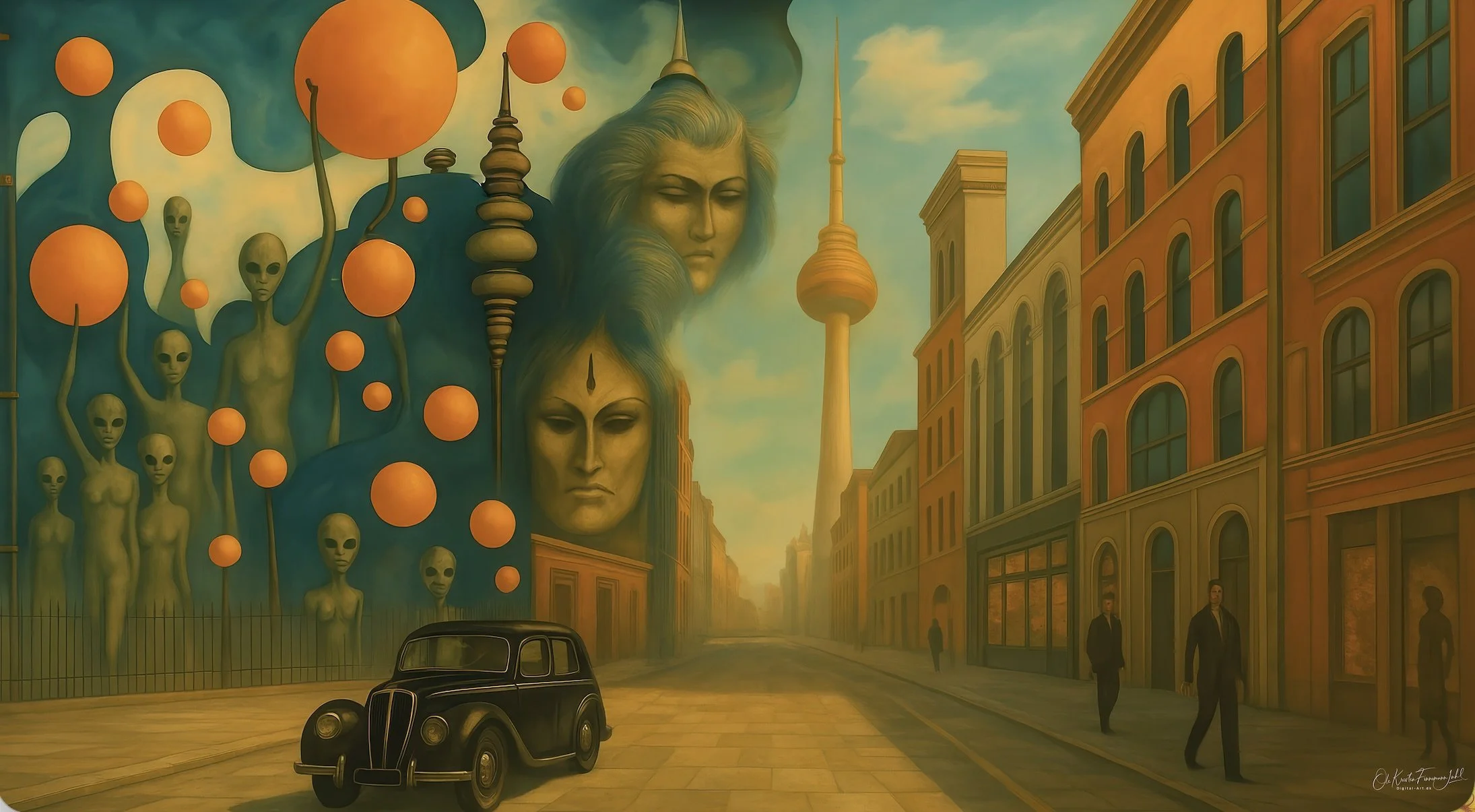 Dette maleri præsenterer en surrealistisk komposition, der blander elementer af fantasi og virkelighed. Scenen viser en gade omkranset af bygninger, langs hvilken en veteranbil er parkeret. Over gaden dukker surrealistiske figurer op fra en skylignende formation. Disse æteriske ansigter fremkalder sammen med flere svævende orange kugler en drømmeagtig eller overjordisk atmosfære. Tilstedeværelsen af et ur antyder temaer om tid, muligvis antydende dens flydende karakter eller en sammenstilling af fortid og nutid. Kombinationen af velkendte urbane elementer og det bizarre, såsom de rumvæsenlignende figurer, skaber en følelse af mystik og intriger, der fremkalder tanker om krydsfeltet mellem virkelighed og fantasi. Belysningen og farvepaletten bidrager til maleriets levende og fantasifulde kvalitet.